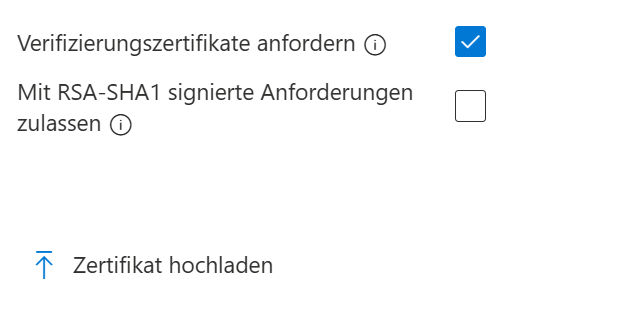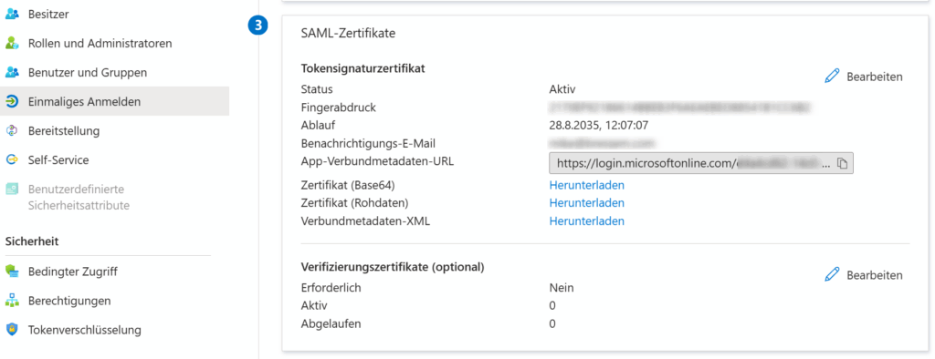 Im EntraID klickt am dann unter Einmaliges Anmelden (was wahrscheinlich eine schlechte Übersetzung von Single-Sign-On ist) auf Bearbeiten des Verifizierungszertifikats: