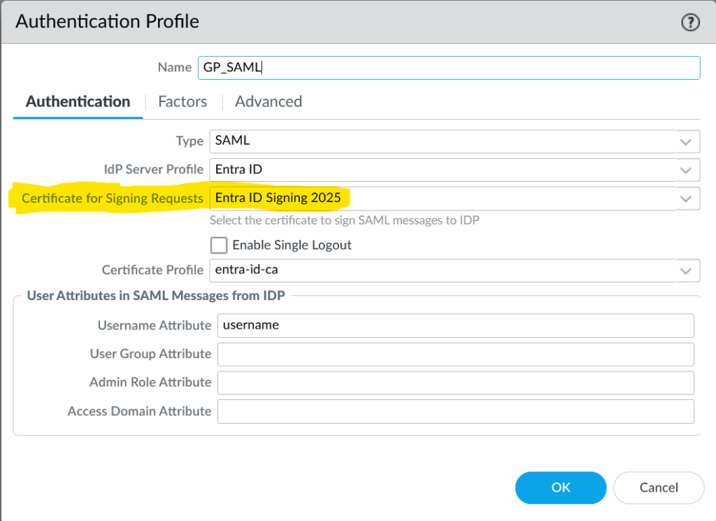 Die PKCS12 Datei importiert man auf der Palo Alto Firewall und ändert dann das Authentication Profile sowie den SAML Provider wie folgt ab: